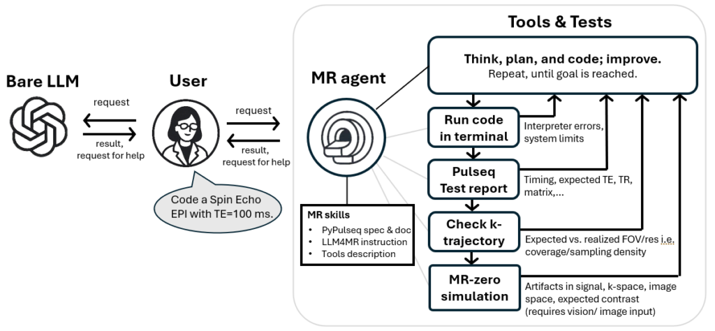 Figure 1: From bare LLM use (left) to Agentic MR sequence development (right). The agent (LLM) enters a loop: write MRI code → execute sequence → receive physics validation → revise code until all criteria are met. This closes the gap between working Python and physically correct MRI sequences.