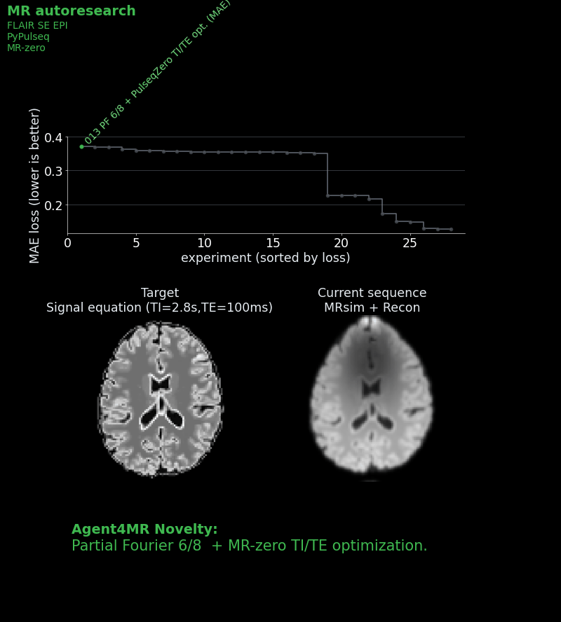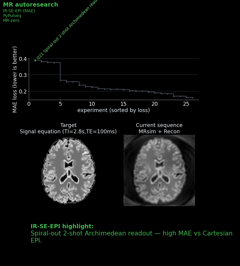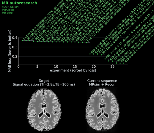 We gave each agent a starting sequence: a basic single-shot IR-SE-EPI with a mean absolute error of ~0.27 against an ideal target image, which was calculated by a signal equation and not by the full simulation. We then and told it: „Read the instructions. Approach to win the challenge!“ Each agent could see the leaderboard and all previous scripts, so strategies could be combined, refined, or dismissed.
