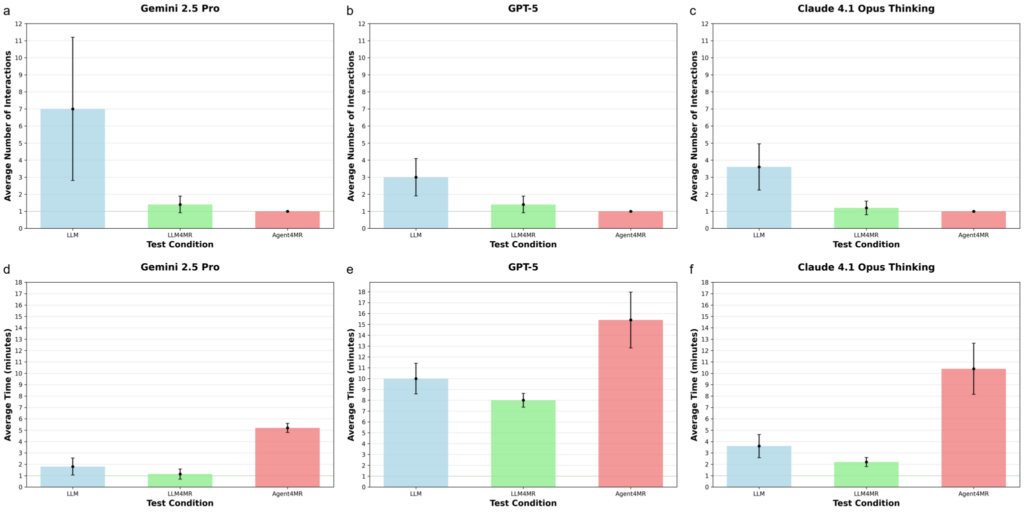 Agent4MR solved the task in a single interaction — every time, across all three LLMs. Zero corrective interventions needed. The agent caught and fixed its own mistakes through the validation loop, leading to a nearly ideal sequence in one shot (Figure 2, right).
