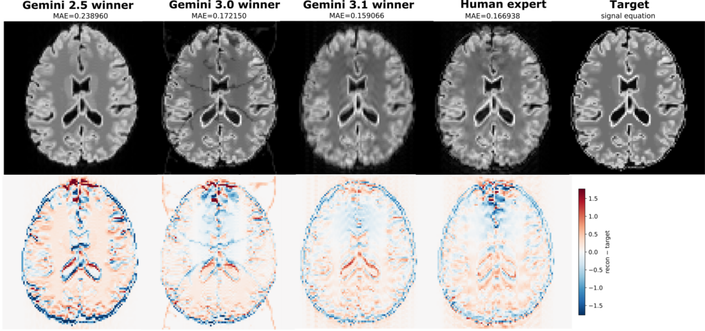 We did not show a scientific breakthrough discovered by the agents. All of the approaches they used were known techniques. Yet, the sheer number of ideas — combinations of sequence tricks, reconstruction strategies, and their interactions — was impressive. Even when not the most elegant, the agents achieved the lowest mean absolute error through plurality. In early versions we also saw some overfitting to the target data, and smart use of information that would not be available for a real scan, but wasn’t forbidden in the challenge. Thus it remains the task of teh human user to check if the agents did not accidentally cheat (or on purpose).
